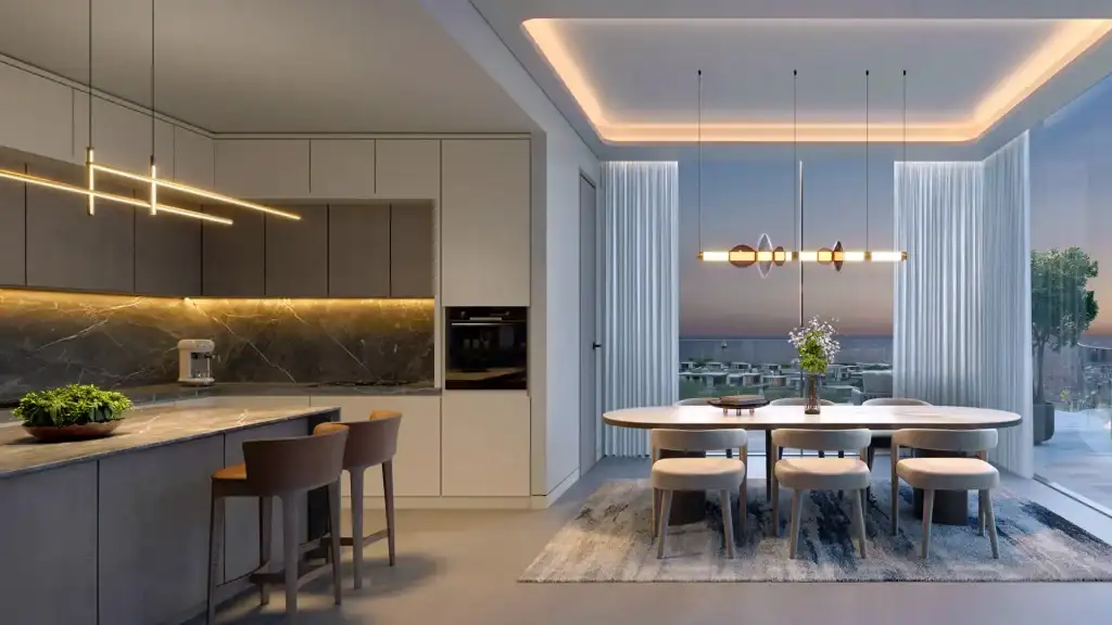 Residents are treated to panoramic vistas of AIDA and the Trump International Golf Course from the infinity pool’s edge, with the alluring Muscat coastline unfolding in the distance. These magnificent scenes are further enhanced by the expansive windows that grace the interior spaces, inviting the outdoors in.